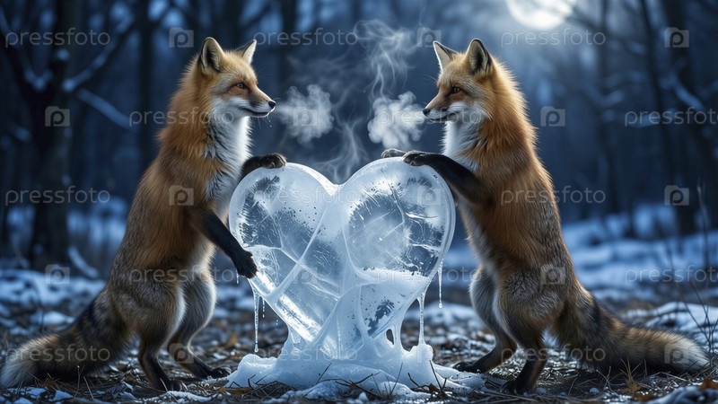 Лисы держат ледяное сердце в холодном зимнем лесу