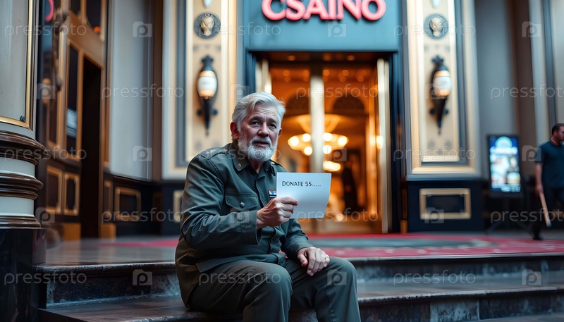Старый бедный ветеран армии в роскошном казино
