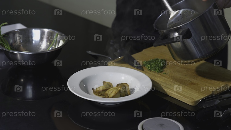 Кук подает пельмени в белой тарелке. Арт. Руки повара крупным планом добавляют масло и зеленый лук в блюдо
