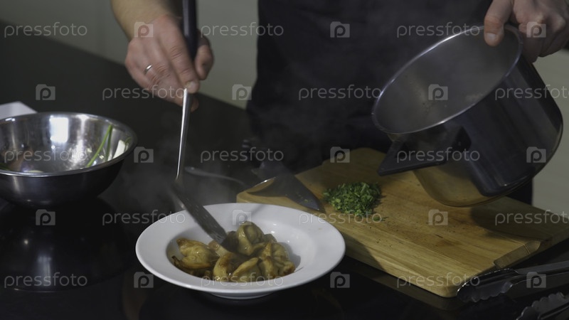 Кук подает пельмени в белой тарелке. Арт. Руки повара крупным планом добавляют масло и зеленый лук в блюдо