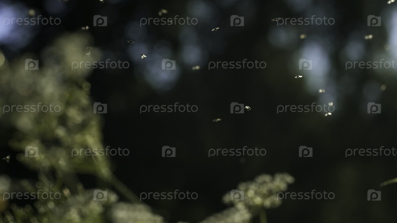 Летние мошки на зеленом лугу летят на размытом фоне деревьев и неба. Творческий. Насекомые летают над растениями под солнцем
