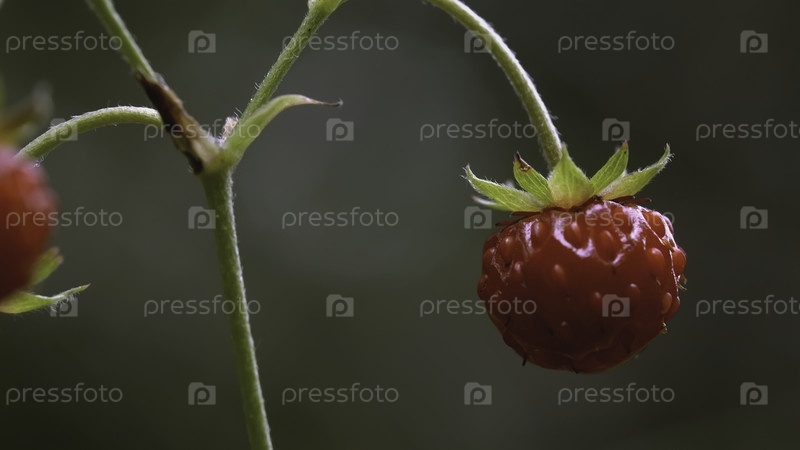 Маленькая клубника на ветке на поляне. Креатив. Близкий снимок маленькой красной клубники в зеленой траве на поле. Цветущий луг с маленькими розовыми ягодами и зеленой травой на заднем плане