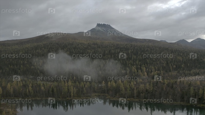 Вид на озеро в лесной части на фоне горы. Красивый пейзаж с небольшим озером в лесу и горой на горизонте. Лес, озеро и гора в облачный день