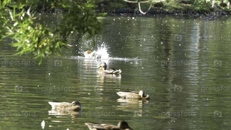 Утки на воде в пруду городского парка. Утки купаются в пруду в городском парке. Утки купаются в городском парке
