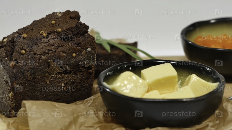 Сливочное масло, икра, черный хлеб. Чаша из красной икры с ложкой подается с нарезанным хлебом, маслом и травами на белом фоне. цельнозерновой хлеб, масло и красная икра, белый фон