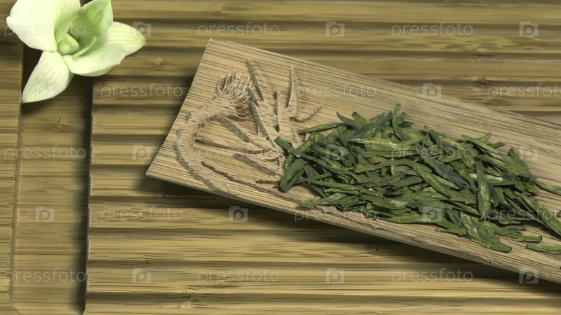 И на деревянном фоне китайские зеленые чайные листья в традиционной чайной церемонии. Китайский чай, церемония