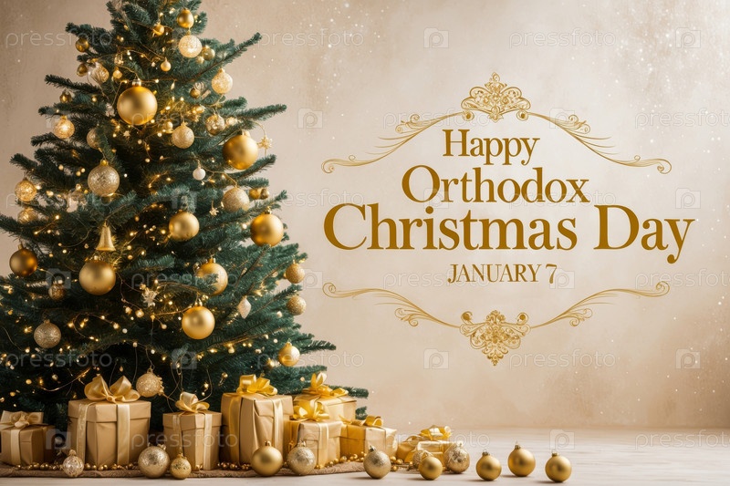 Поздравительная открытка с православным христианским Рождеством на фоне украшенной елки AI Generative