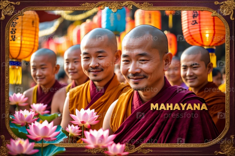 Поздравительная открытка с азиатским буддийским праздником Махаяна Новый год, монахи в оранжевых одеждах AI Generative