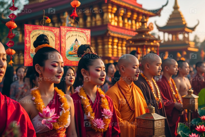 Люди на азиатском буддийском празднике Махаяна Новый год, мужчины и женщины в традиционных костюмах
