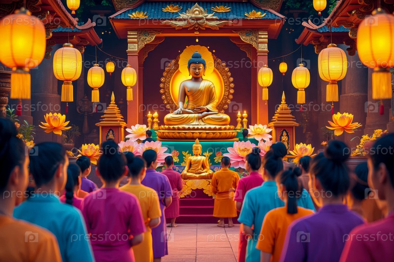 Люди на азиатском буддийском празднике Махаяна Новый год, мужчины и женщины в традиционных костюмах