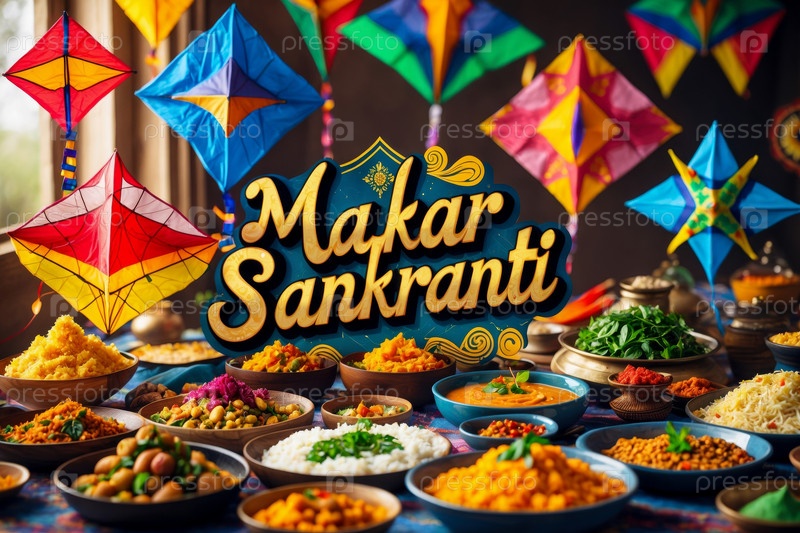 Счастливая индийская и непальская поздравительная открытка Макара Санкранти, текст на фоне кита и традиционная еда