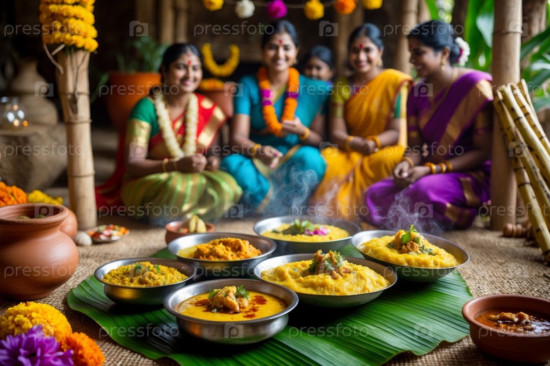 Большая группа друзей празднует традиционный индийский праздник Макара Санкранти, семья за обеденным столом