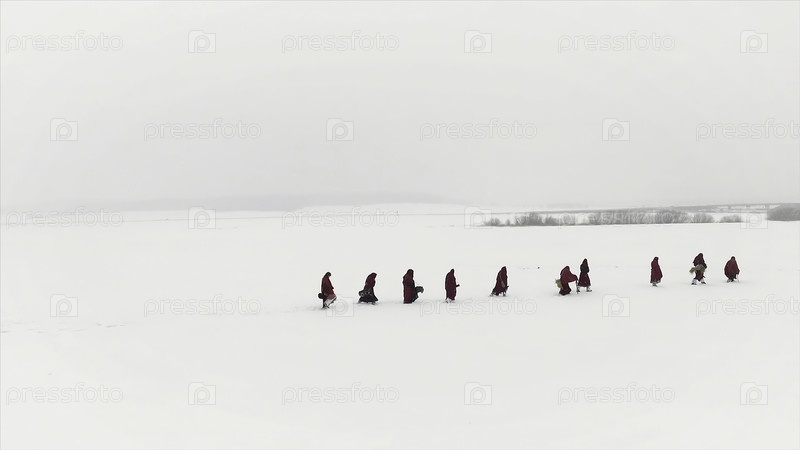 Группа людей, путешествующих по тайге или заснеженному лесу, следует друг за другом. Кадры. Группа людей на зимних походах в горы, туристы, гуляющие по снежному лесу