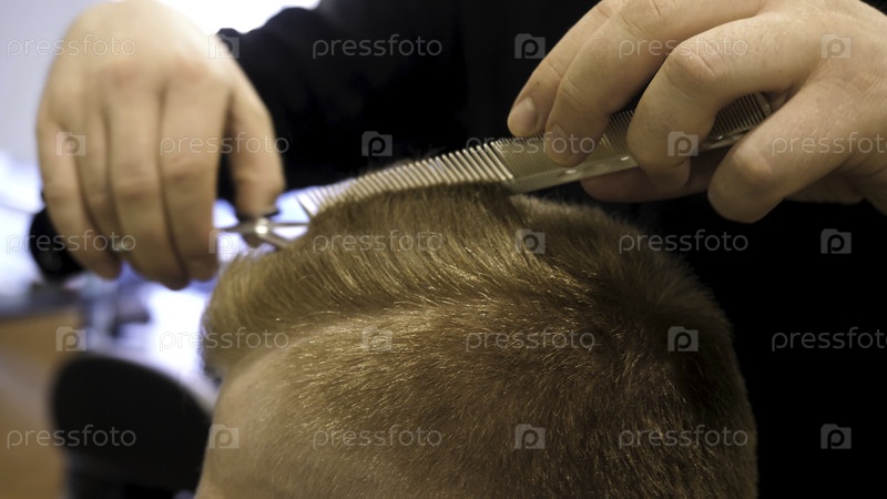 Закройте мужские ножницы для стрижки волос в салоне красоты. Мастер стрижет волосы и бороду мужчин в парикмахерской, парикмахер делает прическу для молодого человека. Закрытие человека в парикмахерской