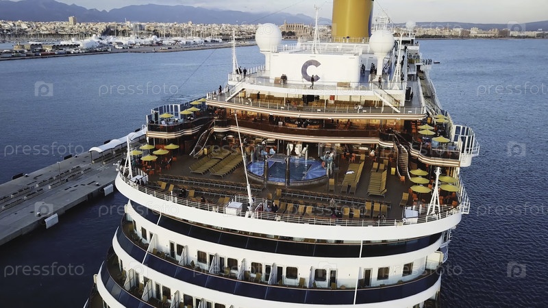 Большое круизное судно, плавающее через море возле гавани. Сток. Вид на огромный круизный лайнер в море. Концепция летнего отдыха, путешествия по воде по всему миру