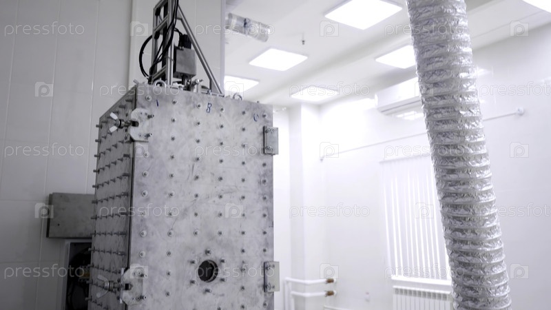 Комнатная стальная печь для плавления металла. Камерная печь для плавки металла с теплоизолированными трубами стоит в белом помещении на предприятии