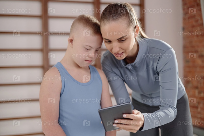 Мальчик с синдромом Дауна смотрит на планшет с молодой женщиной