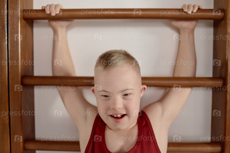Портрет мальчика с синдромом Дауна, улыбающегося, пока висит на лестнице в спортзале