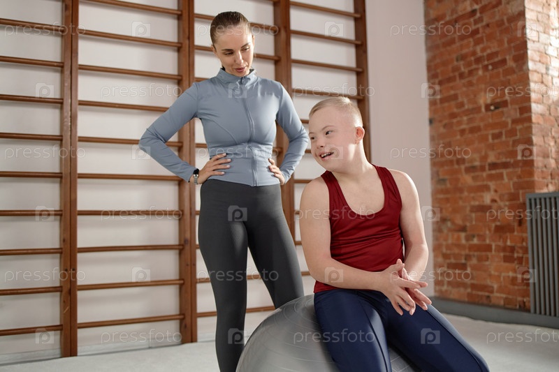 Мальчик с синдромом Дауна улыбается, сидя на тренировочном мяче