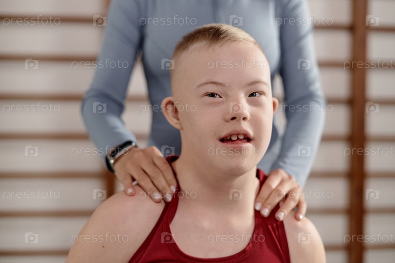 Портрет мальчика с синдромом Дауна, улыбающегося во время физиотерапии