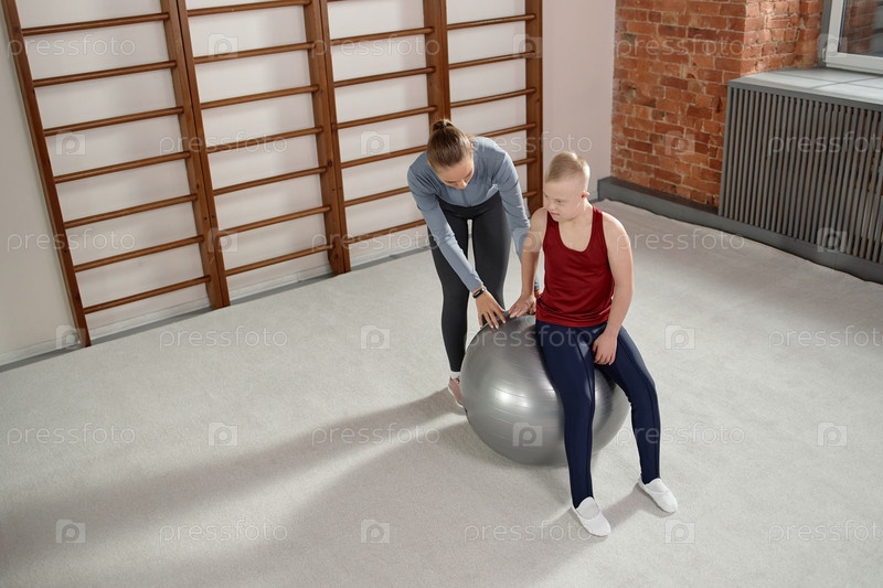 Ребенок с синдромом Дауна сидит на тренировочном мяче вместе с инструктором