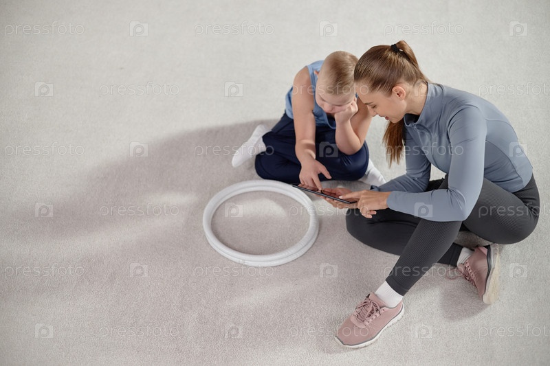 Ребенок с синдромом Дауна использует таблетку с молодой женщиной