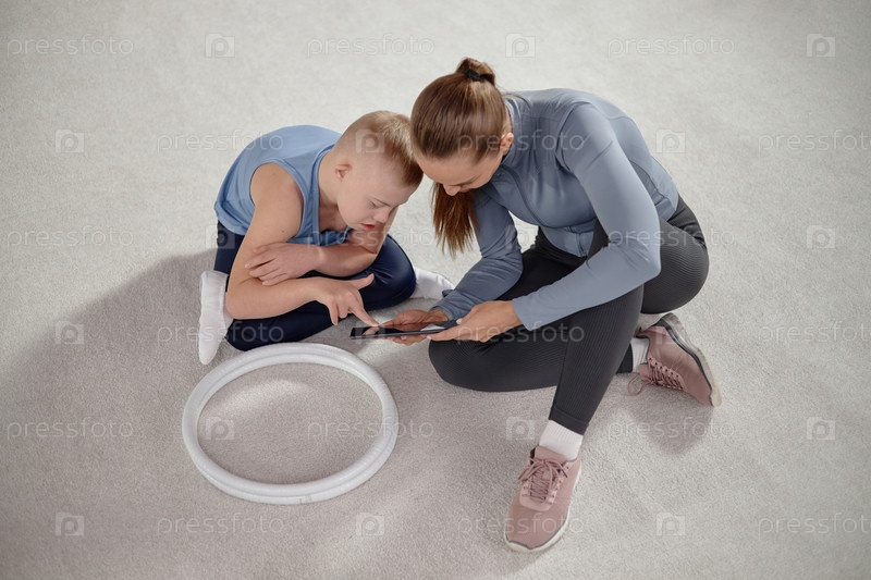 Мальчик с синдромом Дауна учится у молодой женщины, использующей цифровой планшет