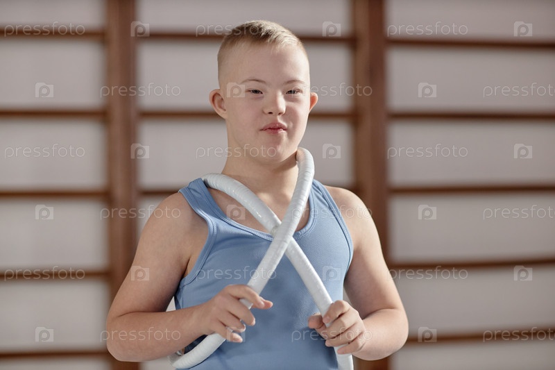 Портрет мальчика с синдромом Дауна, который держит гимнастическую веревку и улыбается