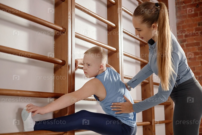 Ребенок с синдромом Дауна растягивается при помощи женского инструктора