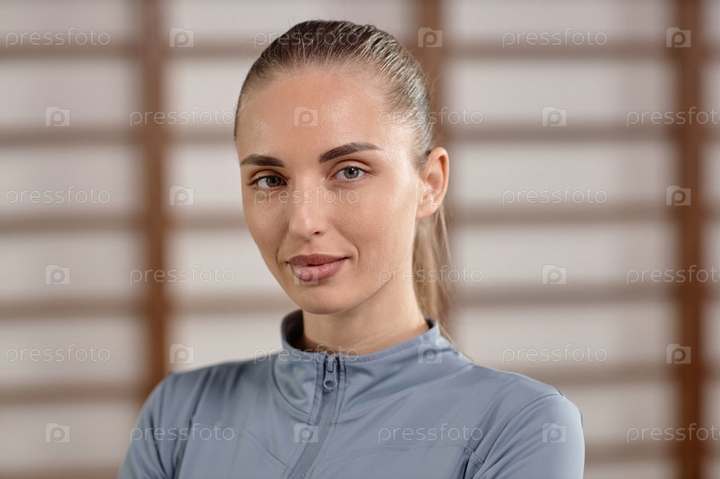 Портрет молодой женщины, улыбающейся уверенно в помещении