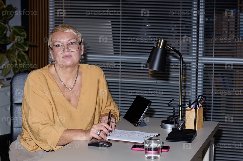 Портрет белой женщины среднего возраста, работающей за столом в офисе ночью