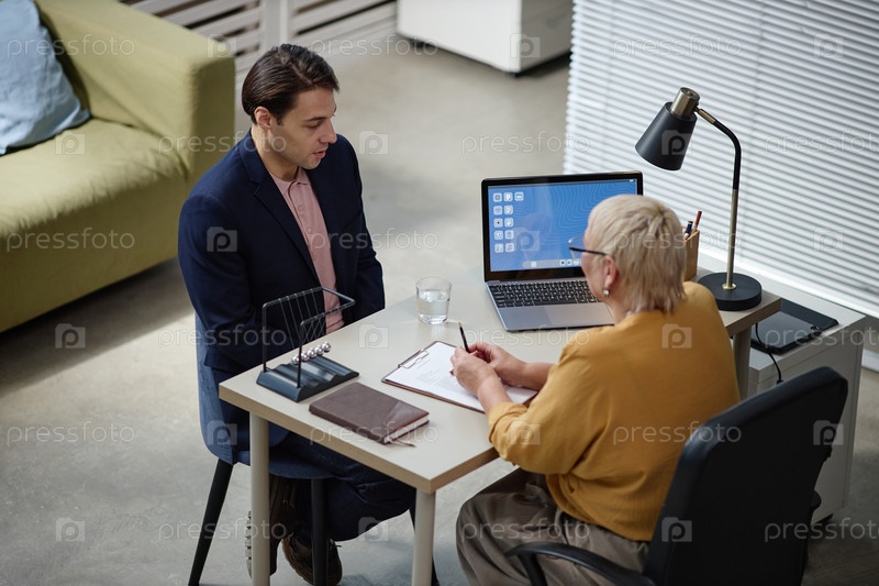 Кавказская женщина среднего возраста, интервьюирующая молодого взрослого кавказского мужчину в помещении