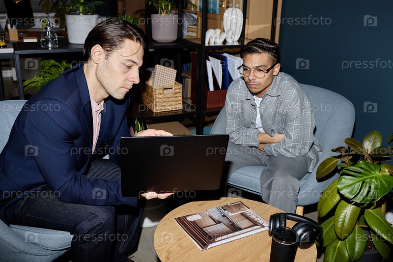 Кавказский молодой взрослый мужчина показывает экран ноутбука своему коллеге-мужчине