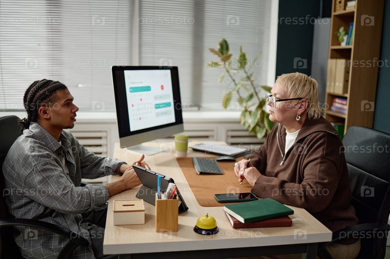Кавказская женщина средних лет консультирует молодого чернокожего в современном офисе