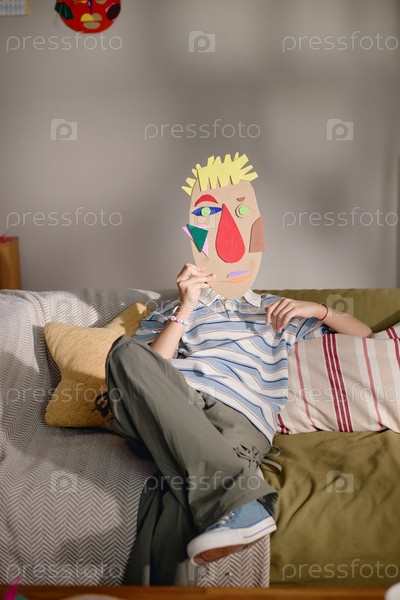 Ребенок Альфа-поколения отдыхает на диване, держа абстрактную бумажную маску