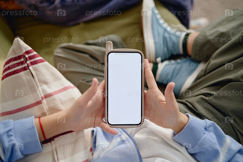 Девушка-подросток держит смартфон с пустым экраном Внутри дома отдыхает