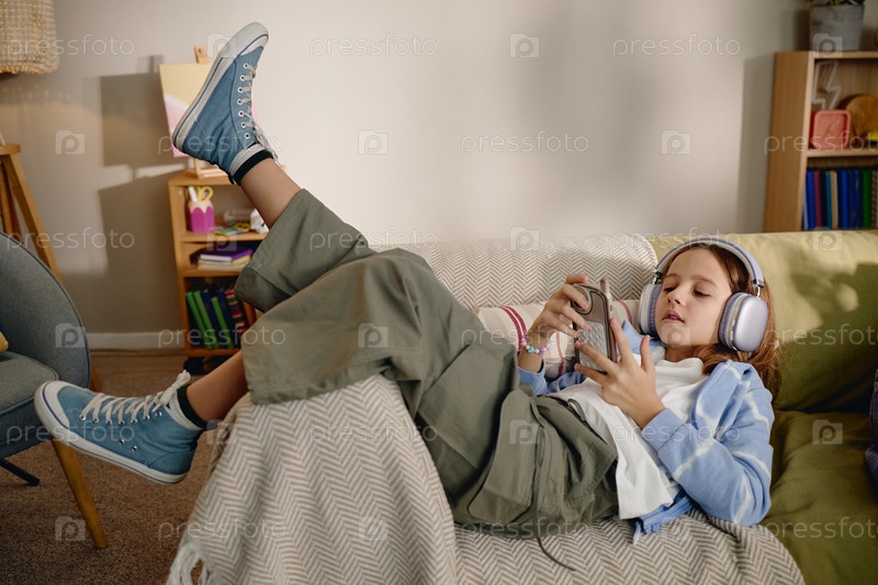 Кавказская девочка-подросток отдыхает на диване, пользуясь смартфоном и слушая музыку