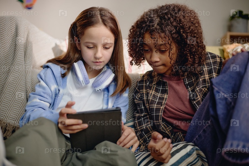 Преteen Caucasian Girl и Preteen Black Girl используют цифровые планшеты вместе