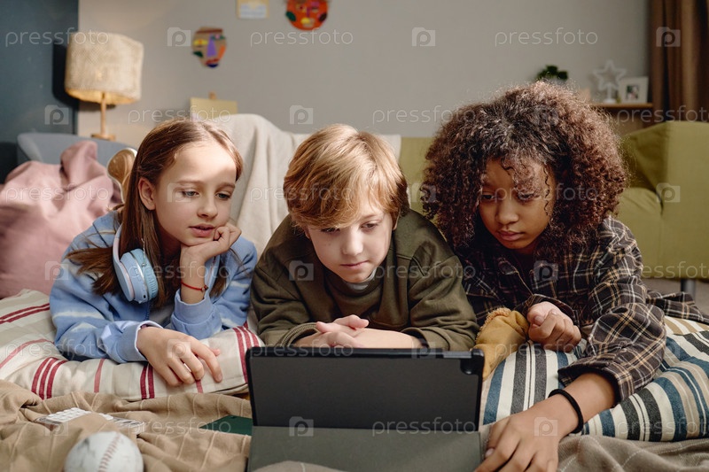 Дети Альфа-поколения смотрят цифровые планшеты вместе в помещении на кровати