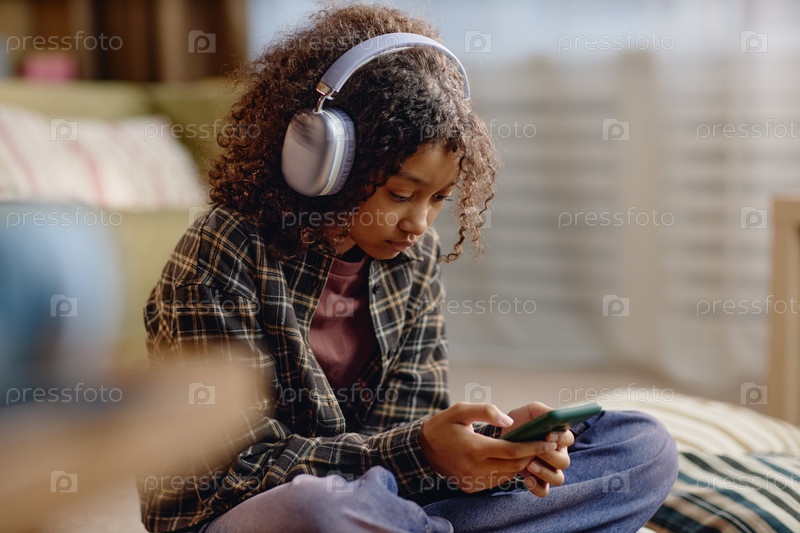 Черная девочка-подросток использует смартфон и слушает музыку с помощью наушников