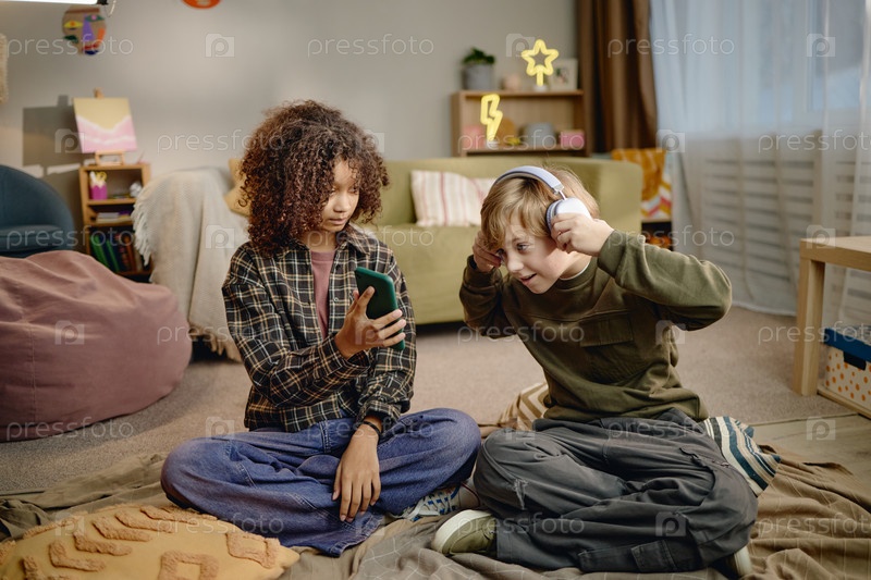 Дети Альфа-поколения используют смартфоны и наушники в помещении вместе