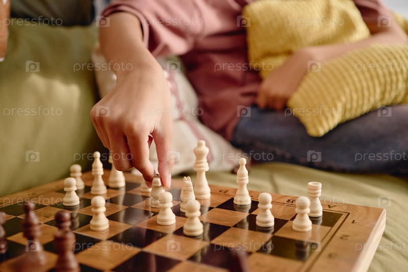 Девушка-подросток играет в шахматы на диване дома