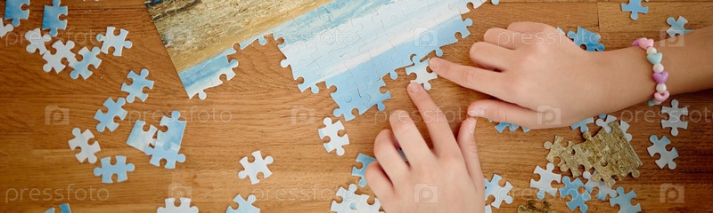 Ребенок собирает кусочки головоломки на деревянном столе