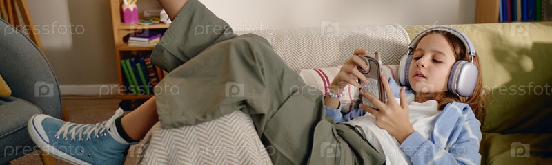 Альфа-девочка кавказского поколения отдыхает на диване, используя смартфон и наушники
