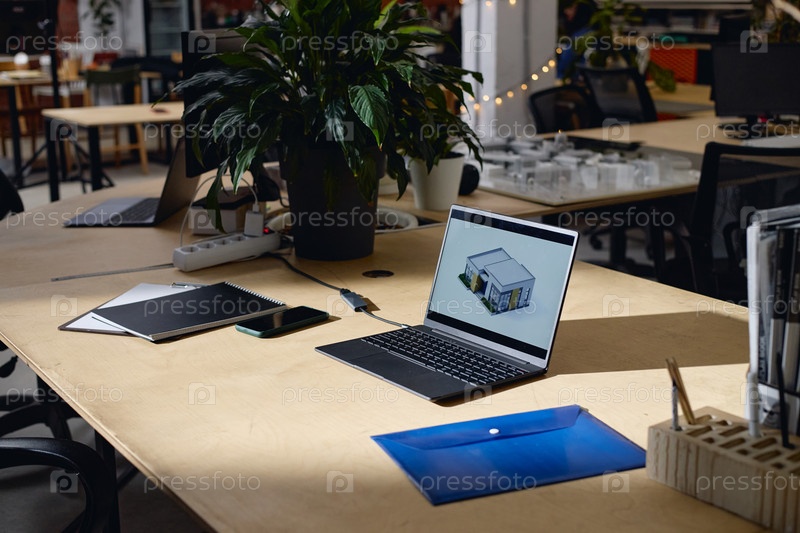Офисное рабочее пространство с ноутбуком, отображающее современное архитектурное рендеринг