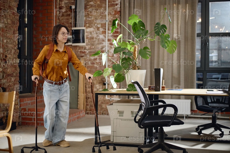Молодая взрослая белая женщина с инвалидностью входит в офис, используя ходовые трости