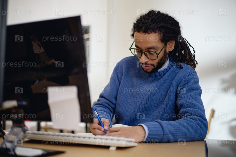 Молодой взрослый чернокожий мужчина пишет записки, работая на компьютере в офисе