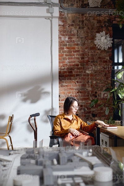 Белая женщина среднего возраста с инвалидностью сидит за рабочим столом