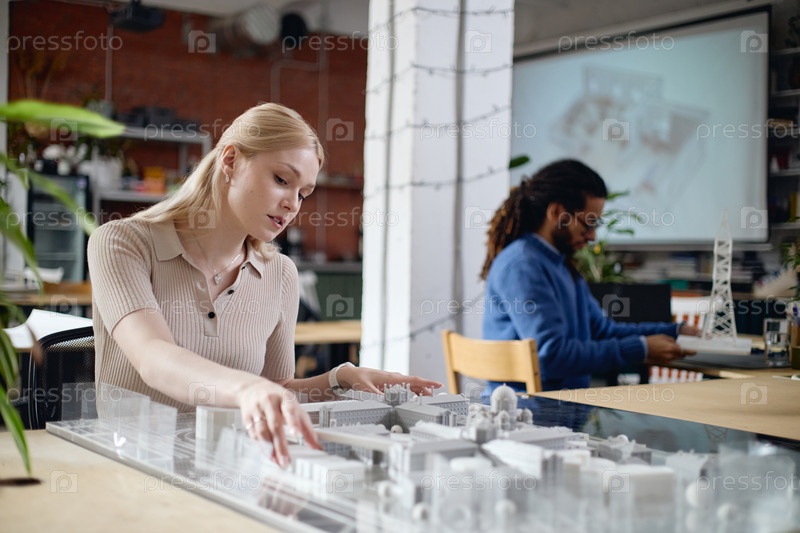 Молодая кавказская женщина изучает архитектурную модель в современной офисной обстановке