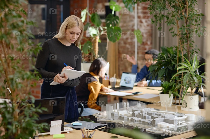 Молодая женщина-архитектор пишет заметки во время работы в современном офисном рабочем пространстве